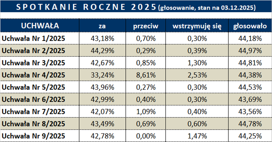 do dnia 04.12.2025, żadna z głosowanych uchwał nie uzyskała wymaganej większości: