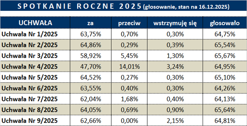 Przesyłamy zatem zawiadomienie o podjętych Uchwałach oraz jednej, która nie uzyskała wymaganej większości (numer 4/2025). Dziękujemy wszystkim Właścicielom którzy oddali swoje głosy!