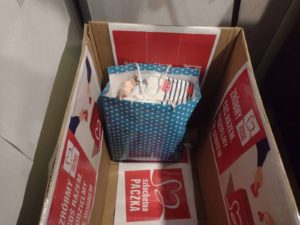 1.Zostawiając potrzebne produkty w pomieszczeniu ochrony, gdzie zlokalizowane jest specjalne pudełko Szlachetnej Paczki lub na dyżurze w pomieszczeniu Zarządu;