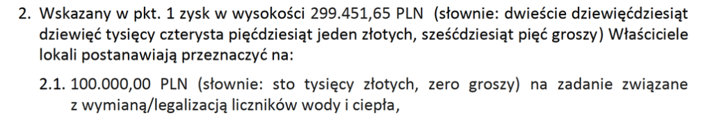 Wskazana kwota 100.000 PLN została rozliczona indywidualnie dla każdego lokalu, proporcjonalnie do udziałów w nieruchomości. Im większy lokal mieszkalny, tym większa korzyść (dopłata do wymiany liczników). Przykładowa kalkulacja dla jednego z lokali mieszkalnych: