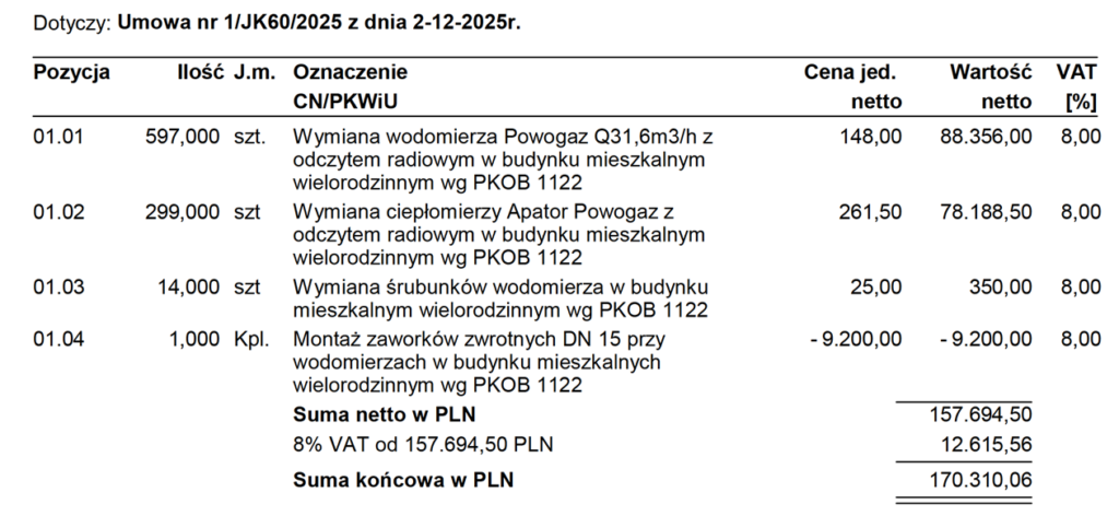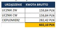 Koszt wymiany zestawu liczników dla jednego lokalu mieszkalnego jest taki sam, niezależny od powierzchni, ilości osób, zużycia mediów i wyniósł 602,10 PLN: